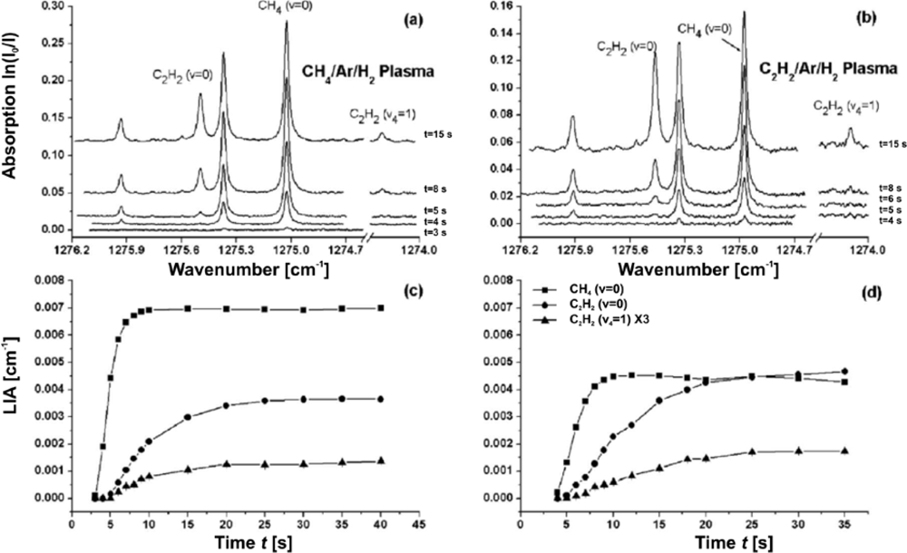 An experimentally interesting aspect of these studies was the time resolved determination of CH4 and C2H2 LIAs during the addition of either methane or acetylene as precursor to a pre-existing Ar-H2 discharge. The 200 μs pulse repetition rate of the QCL and binning of successive spectra (see Figure 7c) lead to a an effective time resolution of 1 s. Figure 9 depicts selected spectra obtained in such a way (Figure 9a/b) and the corresponding time traces of ground state CH4 as well as ground state and vibrationally excited C2H2 (Figure 9c/d). CH4 is apparently the dominant molecule since the absorption path covers mainly the cool part of the reactor. The flow pattern of the injected precursors from the top of the reactor towards this region and the observed low C/H ratio at early times establish the trends in Figure 9c/d.