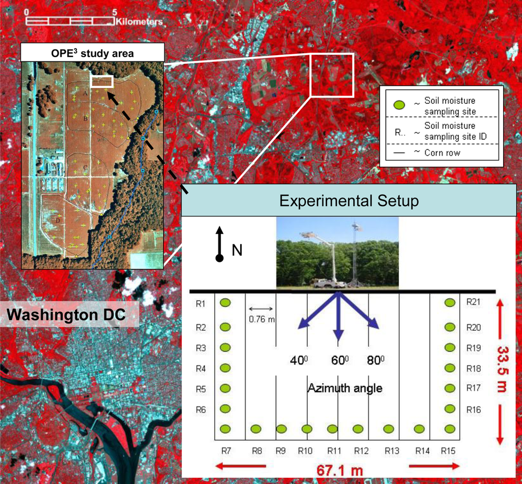 This paper contributes to this understanding by analyzing the L-band H-polarized TB’s measured throughout the complete 2002 corn (Zea mays L.) growth cycle. The utilized data set has been collected at one of the fields of the Beltsville Agricultural Research Center (BARC) by an automated tower mounted L-band (1.4 GHz) radiometer (called LRAD) starting from May 22nd till the beginning of September. These radiometer measurements were supported by a detailed land surface characterization, which took place about once every week and included measurements of the vegetation biomass, soil moisture and soil temperature. Despite mechanical difficulties with the scanning system of LRAD that produced gaps in the data record, a total of ten days distributed over the growing season of both radiometer and ground measurements are available covering a W range from 0.0 to 4.3 kg m−2.