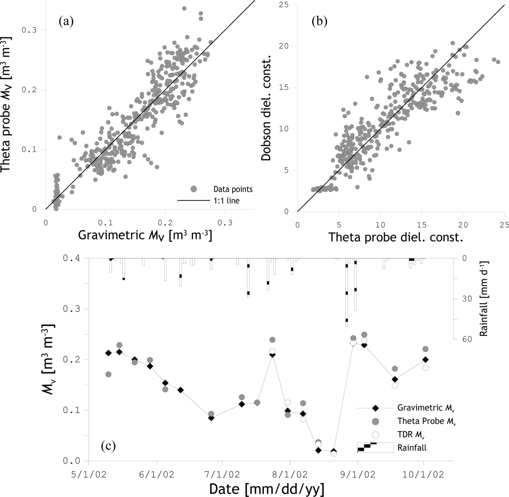 The soil dielectric constant (εr) measured by the theta probe was converted to volumetric soil moisture (Mv) values by fitting a linear regression function through the following relationship (Figure 2a),