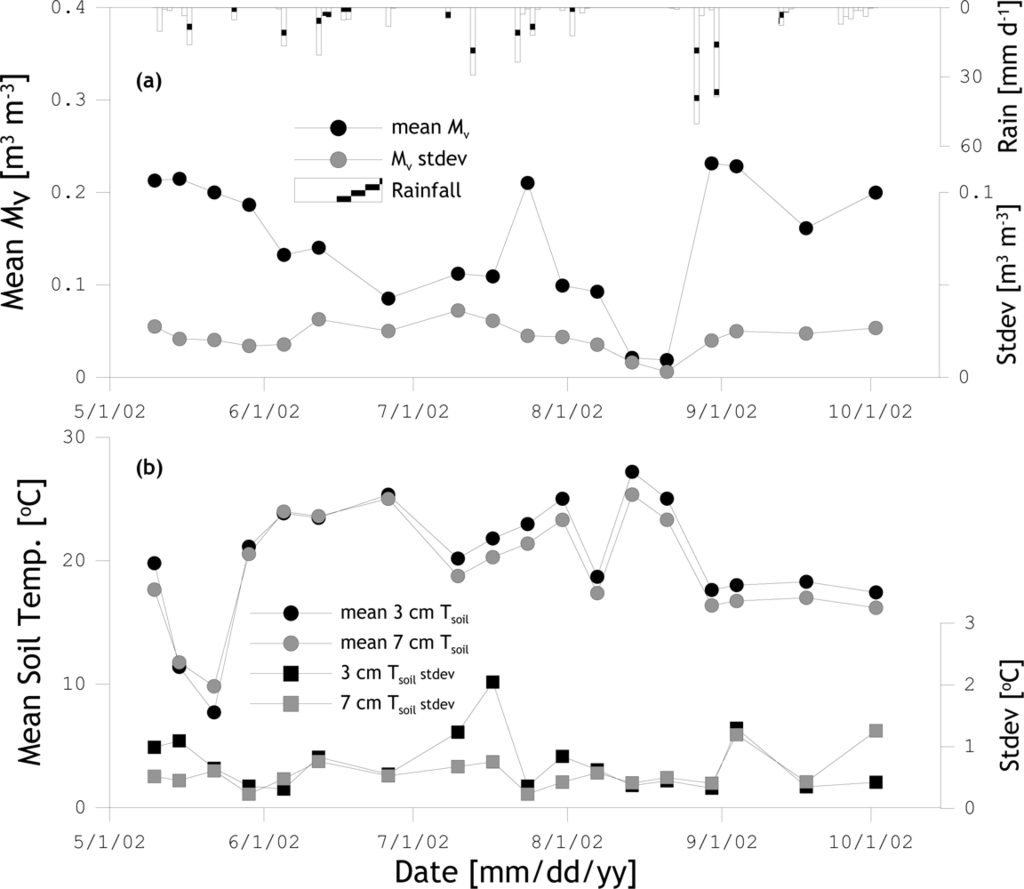 Mean and standard deviation of twenty-one soil moisture (a) and, 3-cm and 7-cm soil temperature; (b) measurements collected around the radiometer footprints.