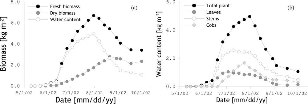 Figure 4a shows the development biomasses and water content of the total plant over time and Figure 4b illustrates the temporal evolution of the water content in individual plant components. It follows from Figure 4b that in the beginning of the corn growing season, the canopy was primarily made up of leaves and stalks. In the middle of the growing season the stem contribution becomes more dominant and cobs’ water content increases to levels exceeding the leaf contribution. Near senescence, water content in the leaves is reduced further, whereas the contribution of the cobs to the total biomass remained constant.
