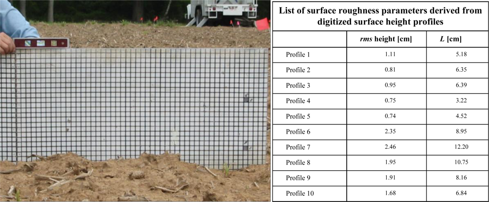 During the experiment surface roughness was characterized on May 25 using the grid board technique. A 2-meter long grid board was placed in the soil and photographs were taken with the soil surface in front. In total, ten surface height profiles were recorded. The surface height profile in these pictures was digitized at a 0.5-cm interval, from which two roughness parameters were derived: the rms of the surface height and the correlation length (L). The averaged rms height and L for the ten observed surface roughness profiles were found to be 1.62 and 12.66 cm, respectively. Figure 5 shows an example of a photograph taken for this roughness characterization and lists the roughness parameters calculated from the digitized surface height profiles.