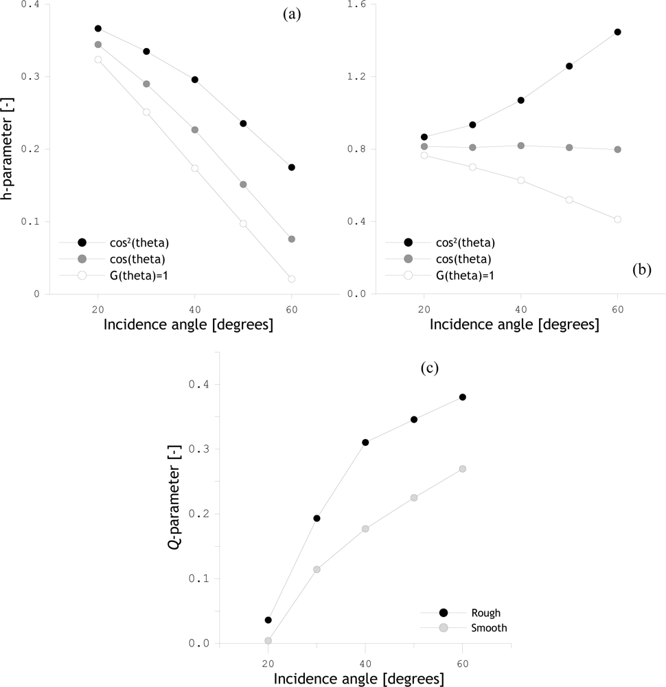 h-parameter as a function of incidence angle calculated from dual-polarized L-band TB’s measured over (a) smooth bare soil surface and (b) rough bare soil surface. (c) Q-parameters as a function of the incidence angle for same smooth and rough surfaces.
