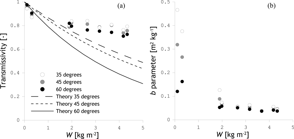 H-polarized corn transmissivities (a) and b parameters (b) inverted from TB’s measured at incidence angles of 35, 45 and 60 degrees plotted against the total plant W.