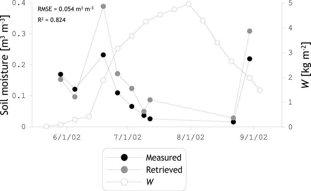 Soil moisture measurements and retrievals obtained by assuming a constant b parameter and ω of 0.12 m2 kg−1 and 0.0, respectively.