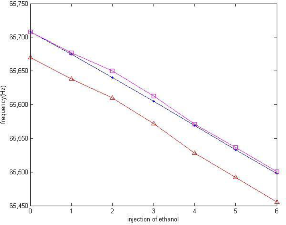 Figure 9 shows the MRF and the SWF as a function of gas concentration. After six sequential ethanol injections of equal quantity, the MRF decreases from 65,670 Hz to 65,455 Hz, and the SWF decreases from 65,708 Hz to 65,498 Hz. A result of simulation of SWF calculated from the MRF measured is also presented for comparison.