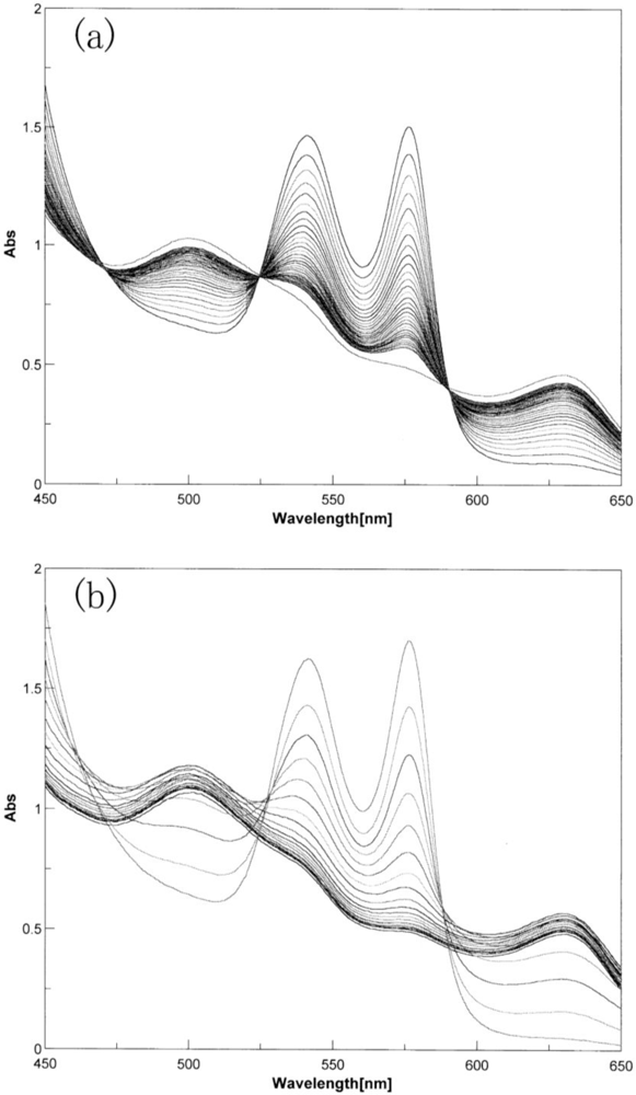 Spectral changes over time associated with hemichrome formation for human HbO2 A redrawn from Sugawara et al. [13]. (a) Monitoring in 0.1 M MES buffer (pH 5.0) at 37 °C and (b) in 0.1 M MES buffer (pH 6.5) at 40 °C. In case a, hemichrome formation was not detected until the reaction was almost 75% complete. In case b, the emergence of hemichrome due to accumulation and precipitation of soluble and insoluble hemichromes was noticeable by sudden disruption of the recorded spectrum at the final stage (at around 17.5 h) of the time course. Conditions: HbO2 concentration was 235 μM (in heme contents); and scanning intervals were (a) 15 min and (b) 150 min.