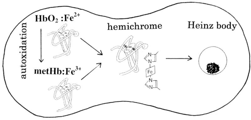 (6) Thus, the Nɛ-nitrogen of the distal His (E7) at position 64 of the α chain and position 94 of the β chain can delicately control the fate of red blood corpuscles through the removal of non-functional erythrocytes from the circulation by causing hemichrome formation and subsequent Heinz body clustering. The rigid intraerythrocytic hemichrome inclusions act as “sticking points” in the spleen, and hence Heinz body-containing red cells become trapped and undergo hemolysis.