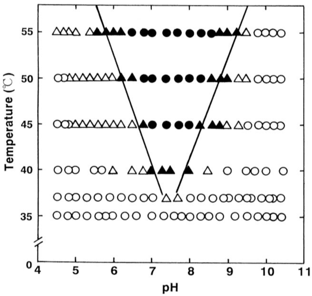 pH-temperature diagram of hemichrome formation for human HbO2 A, redrawn from Sugawara et al. [13]. The symbols represent: •- hemichrome formation noticeable at initial stage during the course of autoxidation; ▴- at intermediate stage; Δ- at final stage; ○- autoxidation reaction proceeded with no hemichrome formation during the entire process.
