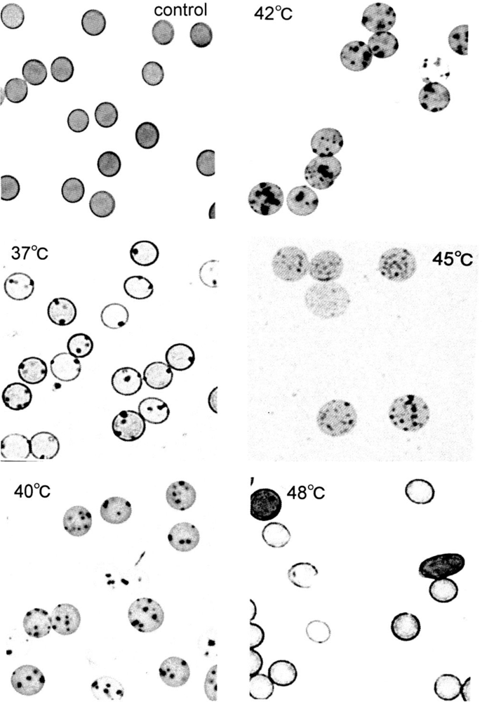 In this section, we discuss the results of our study investigating Heinz body formation in normal human erythrocytes [14]. Aliquots of freshly drawn venous blood from healthy donors were subjected to mild heating at temperatures above 37 °C for 30 min, to investigate hemichrome formation and subsequent Heinz body formation in normal human erythrocytes. Heinz bodies were visualized by exposing blood smears to acetylphenylhydrazine and stained with crystal violet. Changes within the erythrocytes were observed using light microscopy under oil-immersion. Prior to the Heinz body formation test (acetylphenylhydrazine test) [16,17], the blood samples were subjected to mild heating in vitro. A 2-mL sample was placed in a test tube and incubated in a water bath maintained at each desired temperature (±0.1 °C) above 37 °C for 30 min, using NESLAB temperature control (Model RTE-100 or 111 or 210 or 221).