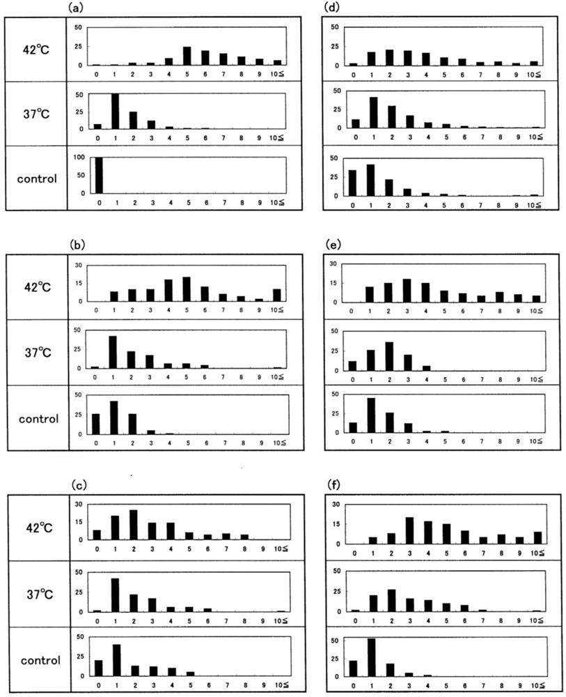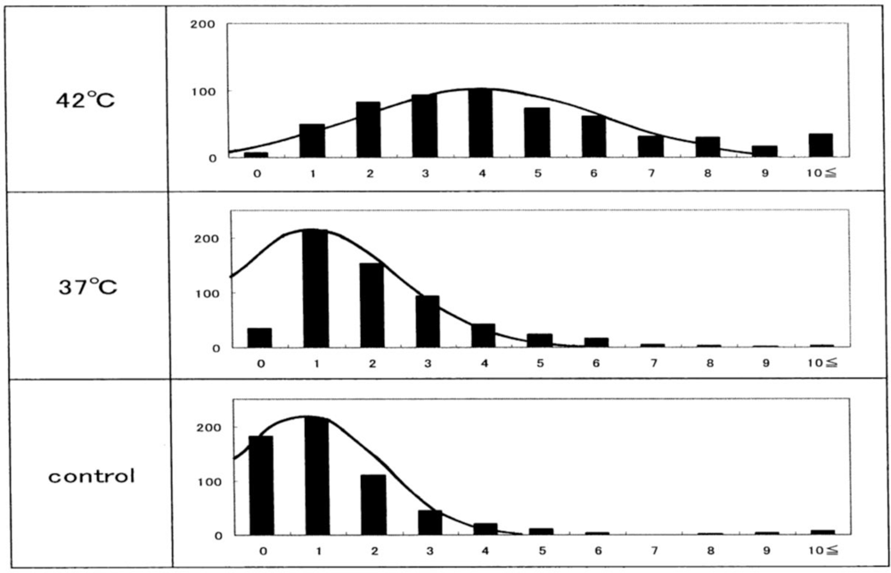 Histograms represent Heinz bodies detected in blood samples after mild heating above 37 °C, redrawn from Sugawara et al. [14]. The histograms for 37 °C and 42 °C are displayed using a temperature-untreated sample as a reference. One hundred red cells were chosen and the number of Heinz bodies contained in each red cell was counted. Figure 4a was constructed from the microscopic views shown in Figure 3.