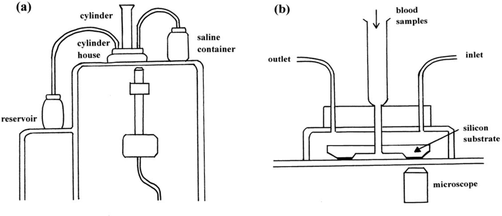 External appearance (a) of a micro-channel array flow analyzer (MC-FAN) and diagram (b) of cylinder house. Blood samples were allowed to flow through the cylinder house by applying a pressure difference of 20 cm H2O (i.e., the difference between saline container and reservoir).