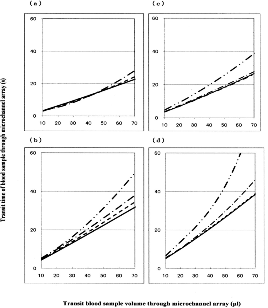 Using a 1-mL disposable syringe and a thin catheter, 200 μL of each temperature-treated blood sample was introduced into a groove array via the cylinder house, which was connected to the inlet hole. The sample was allowed to flow through the cylinder house by applying a pressure difference of 20 cm H2O. Red cells passing through individual micro-channel arrays were monitored using an inverted metallographic microscope, a video-camera, and a video-recorder system. As shown in Figure 7a and b, microscopic images revealed good erythrocyte deformability in temperature-untreated samples subjected to MC-FAN. However, a marked decline in erythrocyte deformability was observed in blood samples treated at temperatures above 37 °C for 30 min. An example is shown in Figure 7c. Temperature-treated samples also demonstrated increased transit time for low transit sample volumes. Figure 8 illustrates some examples of blood fluidity of temperature-treated samples measured as transit time against transit sample volume. These graphs show that erythrocyte deformability decreased with increasing temperature over 37 °C, although there was considerable inter-individual variation.