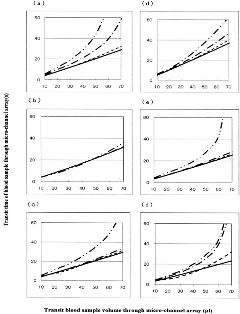 Blood fluidity in samples from six further donors measured in terms of transit time against transit sample volume. Solid lines represent the temperature-untreated control; broken lines represent samples treated at 37 °C; one-point lines represent samples treated at 42 °C; and two-point lines represent samples treated at 45 °C.