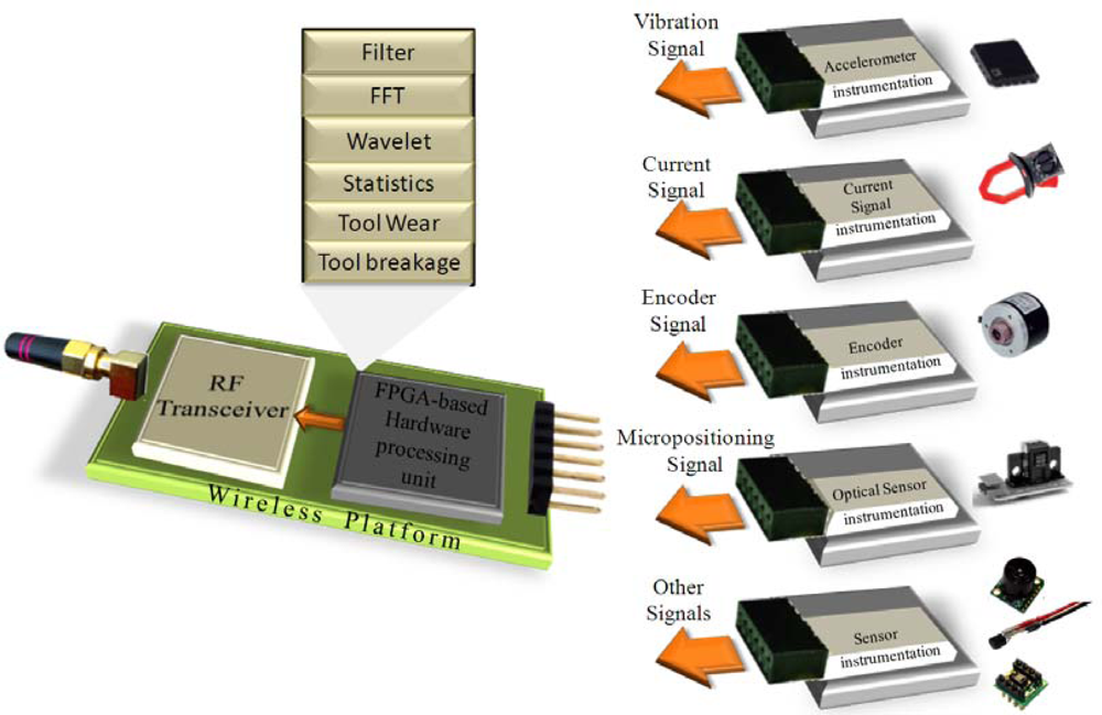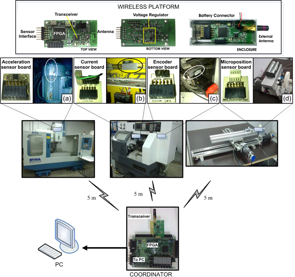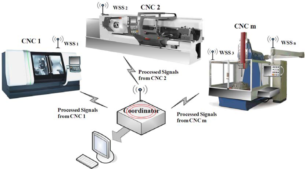 Since their inception, computer numerically controlled (CNC) machines have evolved to adapt to changing technological and industrial requirements. The predominant factor which drove the initial development of CNC machines was the need for increased productivity. The necessity of machining ever smaller components and to comply with the tougher standards that limit the number of defects in these components, requires CNC machines to not only increase their precision, speed and accuracy but also to maintain a high productivity. To cover these needs, new generation machines have to perform monitoring strategies to allow autonomous self-optimization that can be done through the integration of control-process strategies into the machine tool control architecture []. These capabilities are achieved by incorporating multiple sensors [] for online measurement and processing that allow remote monitoring and intelligent maintenance for production maximization []. The installation of these sensors should not affect the machining process [], therefore, the incorporation and use of a wireless sensor network is desirable.