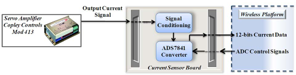 Figure 10 shows a block diagram of the instrumentation system for the feed motor current measurement that is obtained from a typical Copley Controls Corp servoamplifier model 413 with a 5 V/A sensitivity. The resolution of the system is 12-bit given by a 4-channel ADC ADS7841, also a instrumentation for signal conditioning of the motor current is required. This system can measure simultaneously up to four current signals; for this case study, only one channel is used, leaving the others connected to ground.