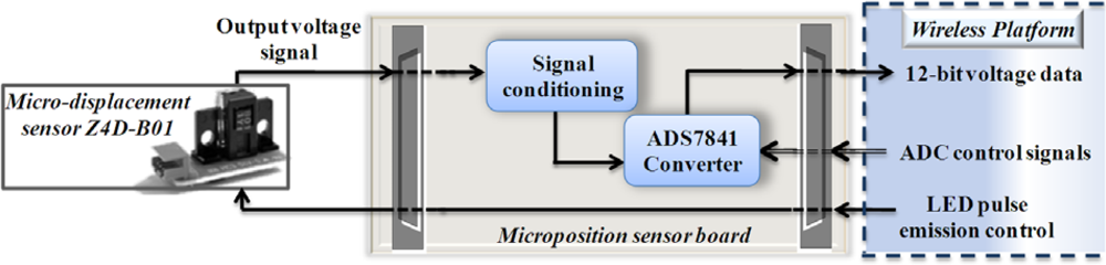 The block diagram for micro-displacement measurement is shown in Figure 12; the instrumentation system is made for an optical sensor Z4D_B01 based on a PSD with a resolution of 10 μm and a 1.4 mv/μm sensitivity. The system contains a 12-bit resolution, 4-channel ADC ADS7841 to convert the voltage signal from the sensor. The instrumentation only uses one channel and the others are disabled as recommended by the manufacturer. A control signal is sent from the wireless platform to control the emission pulse of the infrared LED in the sensor.