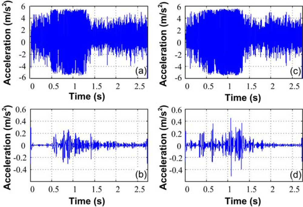 Vibration Signals for induction motor, (a) time-domain signal for healthy motor, (b) DWT reconstruction level 5 for a healthy motor, (c) time-domain signal for a motor with two broken bars, (d) DWT reconstruction level 5 for a motor with two broken bars.