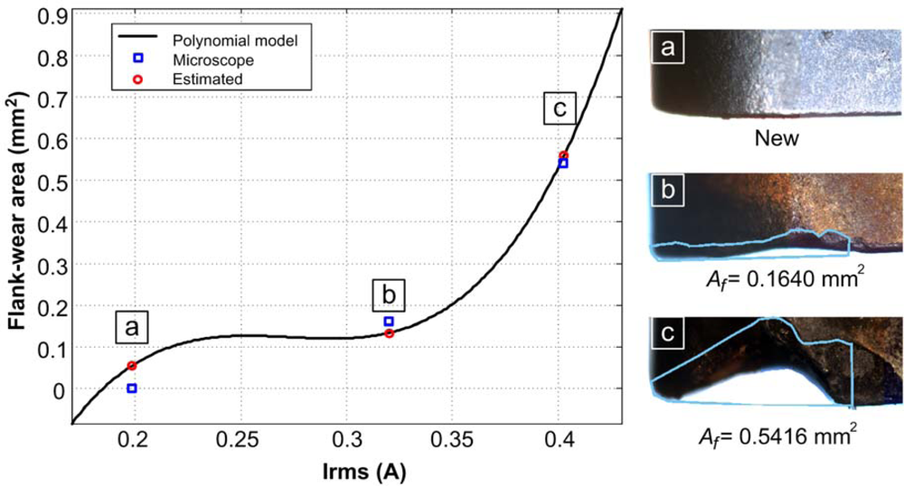 In a next step, the flank-wear area Af is obtained by a polynomial approximation. The polynomial approximation is shown in Equation (7):