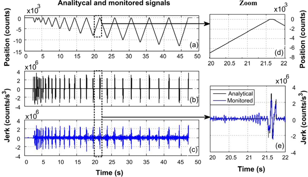 (a) Position, (b) analytical jerk, (c) monitored jerk, (d) zoom of position, (e) jerk analytical and estimated.