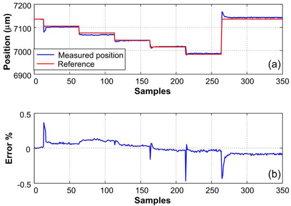 The voltage measurement proportional to distance delivered by the sensor is sent through a WSS to a PC; the distance is obtained graphically in the order of micrometers; then, it is compared to the sent position as shown in Figure 17a. Finally, the error is calculated and shown in Figure 17b.