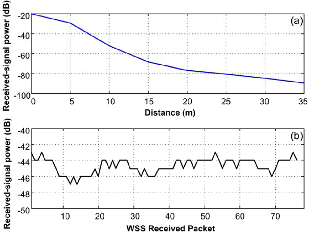 Figure 18a shows the signal strength variation of a node for various distances; Figure 18b shows the signal strength for the vibration WSS during the test.