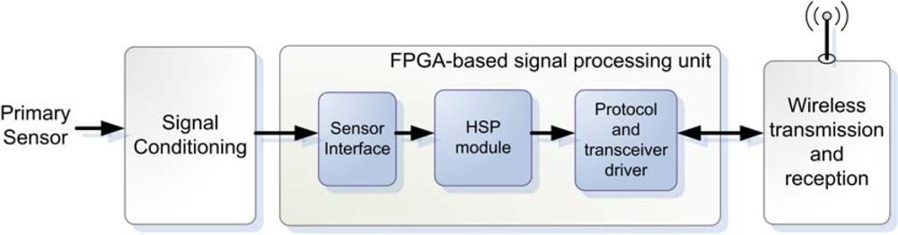 The main feature of the platform lies upon its capacity of incorporating different HSP modules; these modules can be implemented in the hardware processing stage due to its reconfigurability. Figure 4 shows a block diagram of the proposed platform overall structure that depicts the FPGA-based processing stage where the description of an interface is implemented; this interface depends on the specific sensor connected to the platform, and on the drivers for the wireless module. Figure 4 also shows the wireless transmission stage that consists of a radio frequency transceiver and the corresponding coupling circuitry. According to the application, different signal conditioning systems can be connected to the wireless platform depending on the sensors required for such an application.