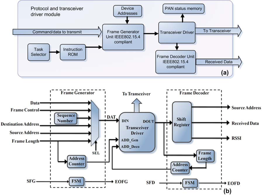 Memory in the transceiver is implemented as static RAM and it is accessible via the SPI port. Memory is functionally divided into control registers and data buffers (FIFOs), to handle the reception and transmission of packets. The frame-generator unit is shown in Figure 3b; it contains a field selector and an address counter to write through the transceiver driver the sequence of data in the transmission FIFO (TXFIFO) according to the frame format specified by the standard containing several fields; frame length, frame control, sequence number, PAN identifier and addressing fields and the data payload that contains the information from the HSP-modules. The first field is the frame length calculated depending of the number of data to be sent; the second field is the frame control defined by the standard and contains information of the frame structure. An 8-bit counter is used to generate the sequence number, this counter is incremented after the previous transmission is succeeded, and PAN identifier and addressing fields are located in a memory outside the module in order to be reconfigured. This module has an FSM (finite-state machine) to control the selector and the counters. The unit has a start frame generation (SFG) and end of frame generation (EFG) ports, in order to be externally controlled.