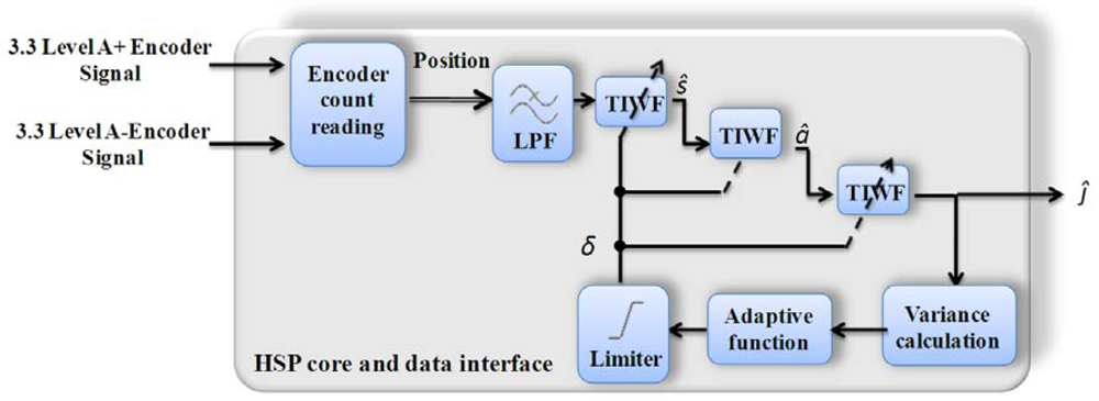 The position signal (p) from the encoder is prefiltered by a low-pass filter; then the signal speed (ŝ), acceleration (â) and jerk (ĵ) are estimated by cascading three TIWF to the filtered signal. To adjust the three TIWF, the jerk variance (σj2) is calculated using (5), then, an adaptive function is applied and limited to obtain the adaptability parameter (δ) which defines the position of the impulse in Equation (3):