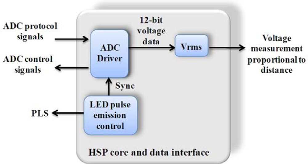 Figure 8 shows the block diagram for micropositioning measurement based on a PSD sensor. The implementation consists of a driver for the ADC, a module for the LED pulse emission control (PLS) and an RMS computation unit for obtain the voltage measurement proportional to the distance.