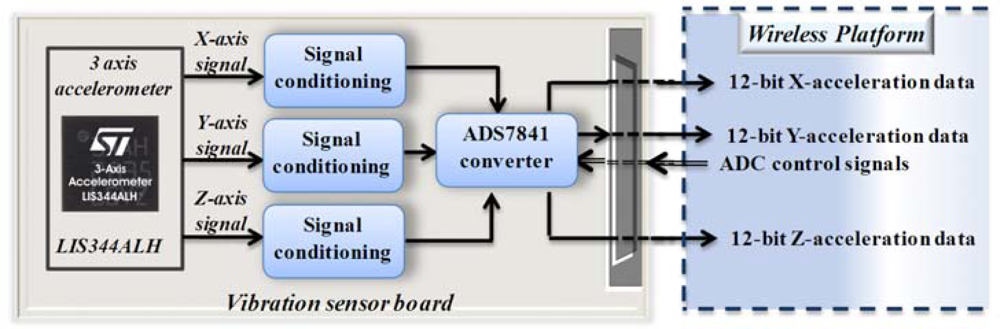 Figure 9 shows the block diagram of the instrumentation system utilized for measuring vibrations. This system consists of a triaxial accelerometer LIS344ALH from STMicroelectronics [], which has a bandwidth of 1,500 Hz for all axes, a user-selectable full scale of ±2 g/±6 g (g = 9.81 m/s2), a 0.66 V/g sensitivity and a 5 × 10−4 resolution over a 100 Hz bandwidth. The system also contains a 12-bit resolution at the 4-channel ADC from Texas Instruments ADS7841 [], with a maximum sampling rate of 200 KHz for the four channels, the unused channel is left unconnected for this application. The control signals and output of the ADC are connected to the interface with the wireless platform.