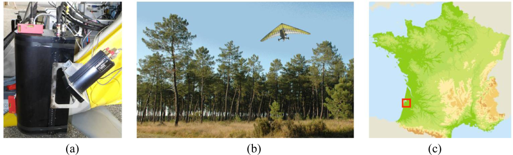 We propose using the compact ultra-violet airborne LAUVAC lidar (Lidar Aéroporté Ultra-Violet pour l’Atmosphère et la Canopée forestière, see Figure 1(a)) that has been designed as a multi-purpose system for research activities with high flexibility in terms of instrumental parameters (telescope field of view, laser divergence and emitted energy). It was developed by the Commissariat à l’Énergie Atomique (CEA) and the Centre National de la Recherche Scientifique (CNRS) to be used for atmospheric pollution [,] and climate studies []. Recently, it was adapted for airborne operation by CEA with the support of Centre National d’Etudes Spatiales (CNES) to study a Maritime pine (Pinus pinaster) forest in the Landes region (France, Figure 1(c)) in the framework of a program initiated by the Institut Pierre Simon Laplace (IPSL) and the Centre National du Machinisme Agricole, du Génie Rural, des Eaux et Forêts (CEMAGREF).
