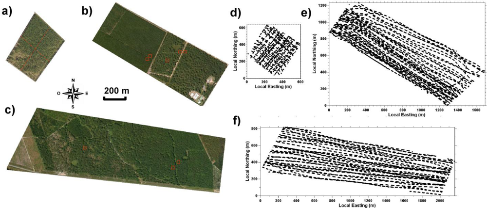 The field experiments were conducted in September 2008 over three test areas located in the Landes forest region near the towns of Bray (test area #B) and Mimizan in southwestern France (two test areas referenced as #M1 and #M2; see satellite pictures in Figure 2(a,b,c)). The selected areas are mainly flat and populated with stands of Maritime pines (see example in Figure 1(b)) spanning a range of ages and either planted or naturally regenerated. These trees may reach a maximum height of 25 m in their mature stage, mostly corresponding to a trunk without living branches roughly 15 m high and a crown with branches and needles of nearly 10 m high and 5 to 8 m wide (e.g., []). The Bray area (#B, Figure 2(a)) is populated by regularly planted 28-year-old trees with a total tree height (TTH) of 20–25 m. The Mimizan #M1 area (Figure 2(b)) is composed of two sub-areas: the southeastern half of the area is composed of a 55-year-old naturally regenerated stand with TTH around 20 m and a northwestern sub-area of young 10-year-old plantation of 10 m height. The Mimizan #M2 area (Figure 2(c)) has several stands of different tree types and heights. From west to east, a quarter of the area is covered by sparse trees and bare ground, a quarter with semi-natural 50-year-old trees with TTH of 20–22 m, a quarter with planted younger 35-year-old slightly higher trees (with TTH ∼23 m) and a quarter of 19-year-old trees with TTH of 15–16 m. Density and height of undergrowth vegetation vary according to the species composition and the management of the stands (particularly dense for young tree sectors and up to ∼2 m for fern patches in the #M2 area).