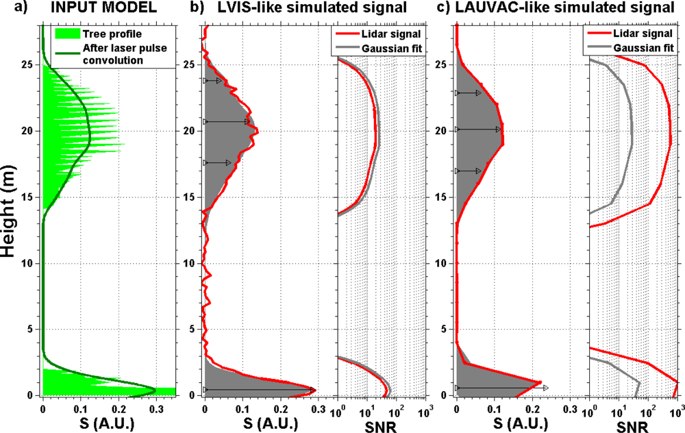 (a) Input model for numerical simulation of a synthetic tree profile before (green shade) and after (dark green line) convolution by a Gaussian laser pulse shape (1.5 m of half-width) expressed in lidar power signal S in arbitrary units (A.U.). (b) Lidar waveform (red line on left panel) acquired by a system like LVIS (see [], with 0.3 m vertical resolution and SNR on the right panel) and Gaussian fit waveform (gray shade) obtained by fitting four Gaussian functions (with locations and amplitudes indicated by black lines with triangles). (c) Same as (b), but for a LAUVAC-like system (1.5 m vertical resolution and SNR up to 800).