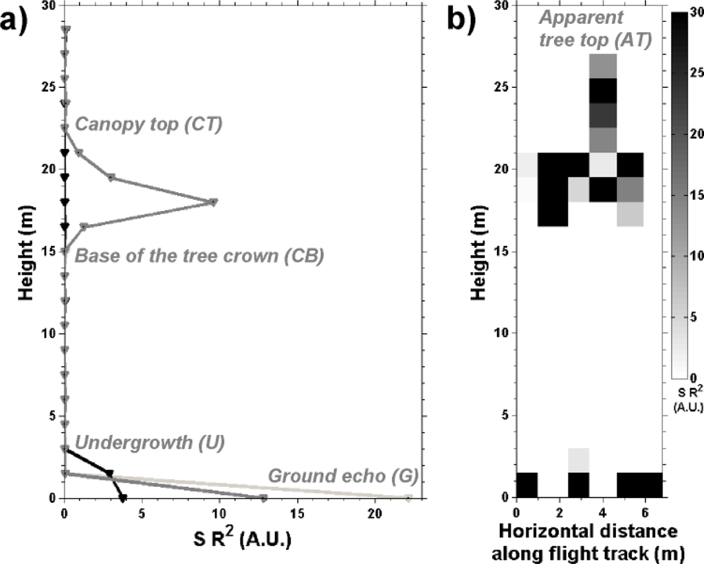 (a) Three examples of lidar profiles: for bare ground (in light gray), ground with undergrowth vegetation (in black) and a single maritime pine with the ground return below (in dark gray). SR2 is the range-corrected lidar signal (in A.U.) (e.g., []). The structural parameters AT, CT, CB and U (in gray and italics) are analyzed in Sections 4. (b) Example of 6 consecutive lidar profiles describing the 2D structure of one single tree crown and undergrowth vegetation.