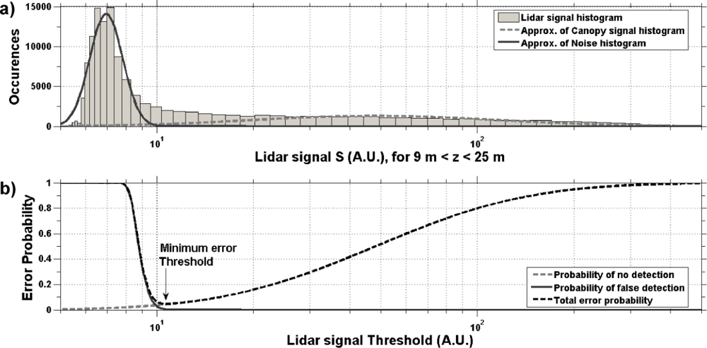 Figure 5(a) shows an example of a histogram of lidar signal S (here between 9 and 25 m above the ground) which is modeled as the sum of two log-normal functions that account respectively for the contributions of noise and canopy returns. We first identify the noise histogram FN (S) as the lower peak of the signal histogram and we fit a Gaussian curve by a classical method (e.g., []). We obtain the probability function of the useful signal FS (S) from the remaining part of the histogram. Then, we calculate pF and pN as (e.g., []):