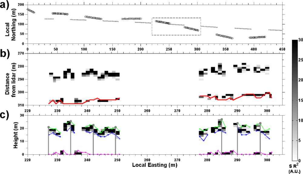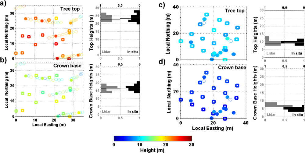 Figure 9 shows a comparison of tree top and crown base heights as measured in situ (open bold squares) and by airborne canopy lidar (plain circles). Within the 7 m uncertainty on lidar footprint location at ground, very good agreement is found for measurements that are likely to correspond to the same trees in Figure 9(a,b) (e.g., for geo-location at 28 m LE, 18 m LN; 22 m LE, 13 m LN; and 13 m LE 26 m LN). Good measurements consistency is found for the histograms of tree top and crown base height measurements (to the right of Figure 9(a,b)).
