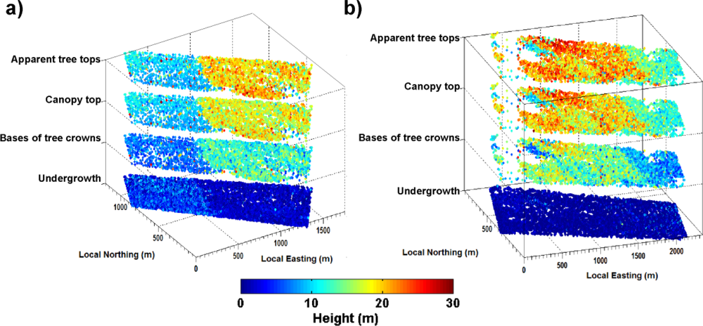 Figure 9(c) indicates that for a young tree sample plot (#M2B) we obtain good matches (±1 m) for measurements of tree tops (e.g., at 15 m LE, 33 LN; 28 m LE, 8 LN; 21 m LE 3 m LN), but an overestimation of ∼2 m for the crown base (see histogram to the right of Figure 9(d); as mentioned from Table 3).