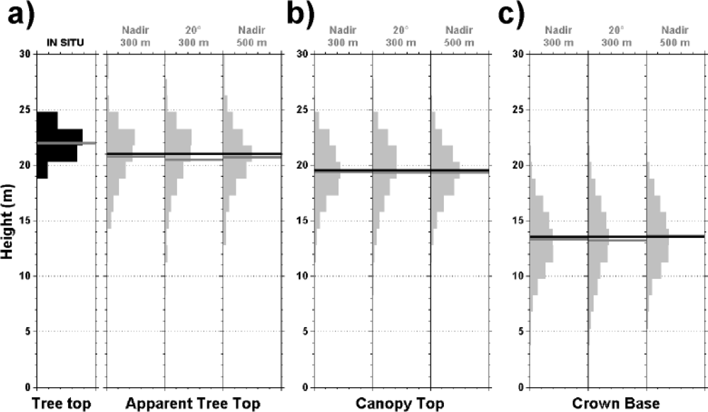 For such a non-optimal threshold value, it results in 1.5 m underestimation of the canopy top (and AT). So, for too high threshold value the weak signal that marks the canopy top transition may be missed. However, this bias cancels when the optimum threshold is used (see Table 2 and Figure 8). For the crown bases heights (and ground returns), a robust detection is indicated by almost identical results for the three flights (Figure 8(c)), even using different thresholds (see Table 2). This is probably due to a higher density of the scattering volume (foliage and branches) for the crown bases.