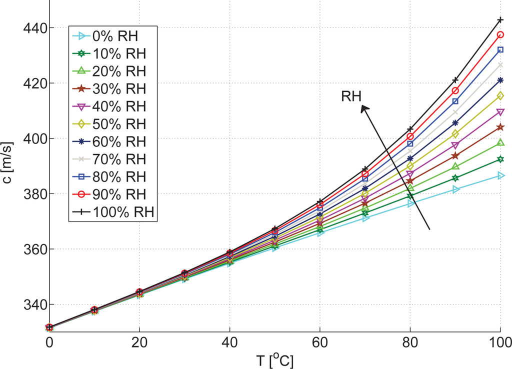 The relation between the speed of sound, temperature and relative humidity according to Equation 2 to 4 is given in Figure 1. Note that sensitivity for c increases with increasing temperature and with increasing RH.