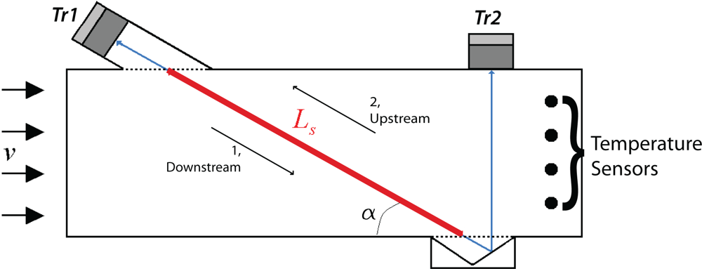 The average gas flow velocity is determined from the difference in transit time in upstream and downstream direction over the part of the acoustic trajectory Ls. Ls is the part of the acoustic trajectory where the ultrasonic waves have a component in the direction of the gas flow (thick outline in Figure 2). The average transit time is given by: