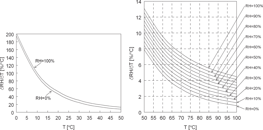 Derivative of relative humidity to temperature vs. temperature for relative humidity of 0–100 %. For example: at 90 °C and 20 %RH, an error of 1 °C in temperature induces a 2 % error in relative humidity.