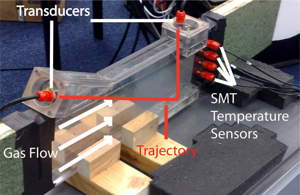 Recently, many studies for humidity sensors have been published, particularly acoustic sensors. However, most of these recent developments in acoustic humidity sensors are based on Surface Acoustic Wave (SAW) sensors, which works with another principle, see the work of Wu et al. [3], for example. A comprehensive review on magnetoelastic sensors which can be applied for humidity measurements is given by Grimes et al. [4]. The above mentioned conventional and SAW techniques for humidity measurement are local techniques, i.e., with a measuring volume in the order of one cubic mm. The acoustic technique of the present paper, on the other hand, yields a chordal beam average of humidity in the desired portion of the duct. Another type of acoustic sensor was developed by Zipser et al. [5], which has a different layout and is not in-line. Tsai et al. uses an ultrasonic sensor for temperature measurement with a correction for humidity [6].