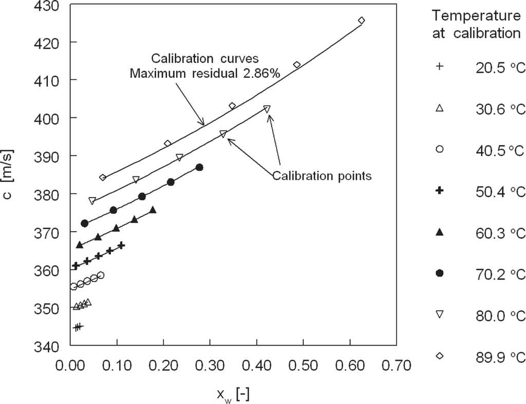 The coefficients {ai} are determined by calibration in reference air of known temperature, T, known humidity, RH and known speed of sound at the measurement frequency, c. From 2, the mole fraction of water vapor, xw, is determined. Relative humidity is then calculated with the aid of: