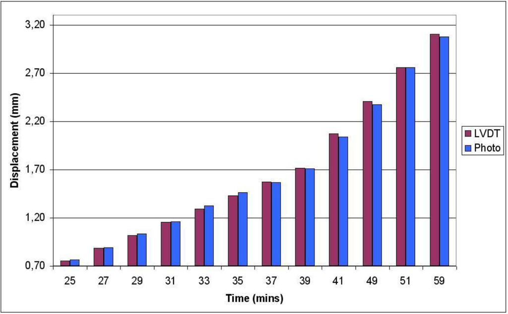 Figure 10 shows the displacements measured with a LVDT and with the image-based method, in which the vertical movements of a target close to the LVDT were employed. The standard deviation of the differences is equal to ±0.02 mm and the final displacement is larger than 3 mm. This means that the accuracy of the photogrammetric method is more than sufficient for this experiment. Moreover, the analysis of several targets distributed on the object allow the estimation of 3D movements (Figure 11) and the rotation of the foundation.