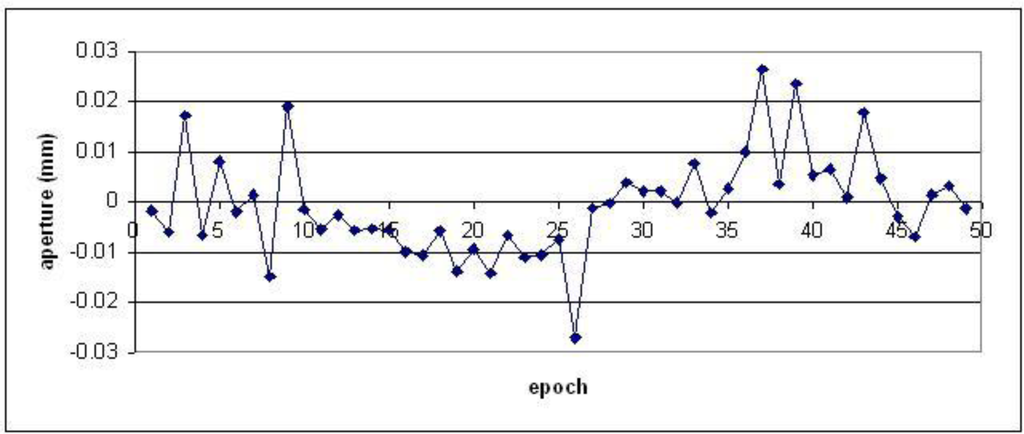 A preliminary analysis of the markerless method was carried out for the example proposed in Figure 9. A small piece of rock was placed on the fixed plate of the sledge, while a second piece on the movable part. The imaged area is 15 × 15 cm roughly. With this test some changes in aperture and depth were simulated and their magnitude was measured by using two orthogonal comparators. The results after this check demonstrated an accuracy of ±10 μm in the estimation of the aperture and ±7 μm along the depth.