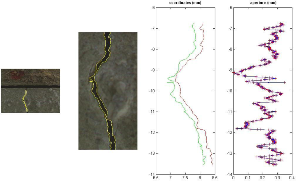 The scale factor was estimated by measuring the size of a pixel projected onto a reference object (a small metal plate) placed on the specimen. The size of this object was measured with a calliper: it is sufficient to divide the width of the plate by the number of pixel picturing the object to determine the scale factor. With the INFINITY camera a pixel covers an area of 9 μm × 9 μm, which is also the accuracy of the implemented tool (see next section for further details). The output interface of the tool, which gives a graphical and numerical visualization of the crack aperture, is shown in Figure 2. The procedure is quite simple: the user just has to select a crack in an image and the dynamic analysis can be carried out in automatic way. This task is performed by considering corresponding images taken at different epochs. Lastly, the aperture variations can be estimated by using the variations detected at different epochs (relative measurements).