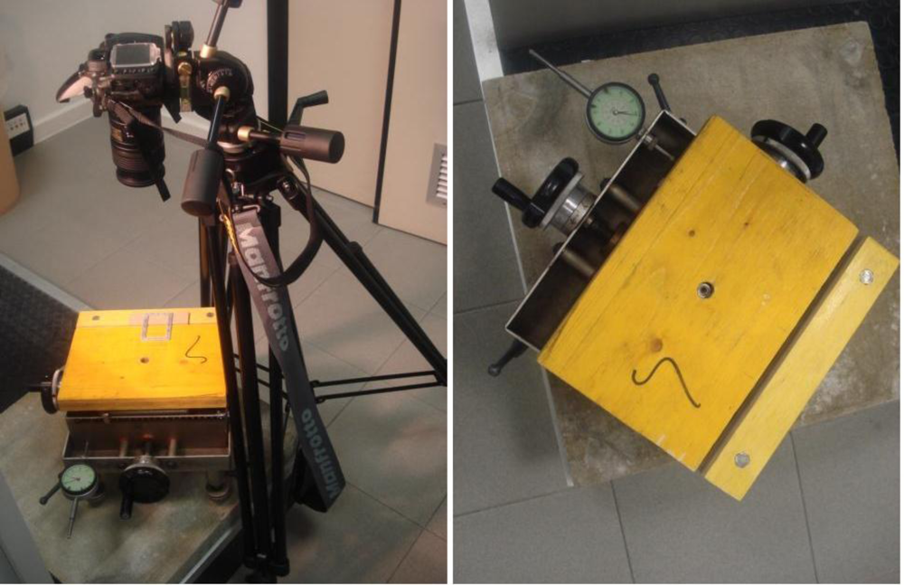 To check the accuracy of the implemented method a comparison with other sensors is mandatory. Nowadays, a system capable of measuring the aperture variations in fluid elements with an accuracy and a density better than the implemented tool is not available. This means that accuracy cannot be checked with experiments on fluid specimens. To overcome this drawback we developed an alternative solution with a solid object and a special micrometric sledge (Figure 3), which is composed of two plates (the first one is fixed while the second one can be moved with two micrometric screws in order to simulate a planar motion). Two mechanical gauges provide the magnitude of the displacements with an accuracy superior to ±0.01 mm. The sledge allows one to simulate the aperture of a “synthetic crack”, where all points have the same displacement (rigid motion). Anyway, this is sufficient to check the accuracy of the image-based method.