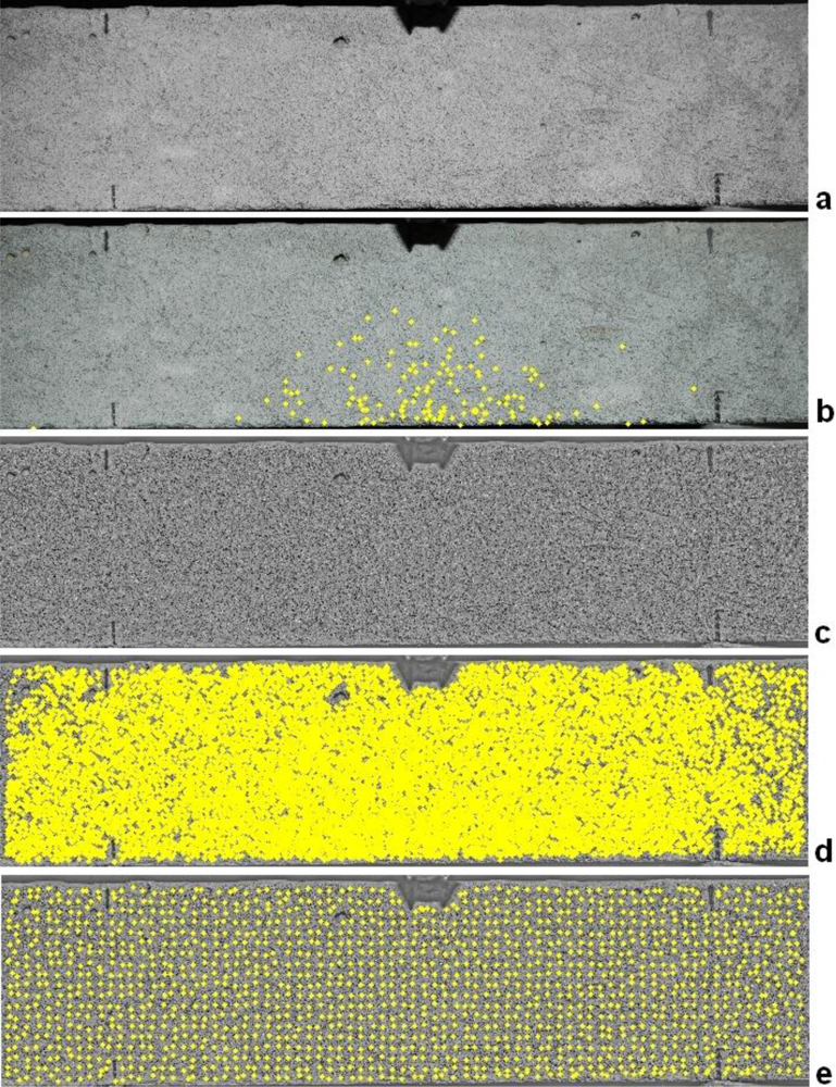 Figure 7 shows the original image of a small beam (a) and the detected corners with the FAST operator (b). As can be seen, few points can be measured. The filtered image (c) provides more corners (d) with a better distribution. At the end of the process points can be mapped (d) onto a “quasi” regular grid (in this case each cell is 50 × 50 pixels roughly).