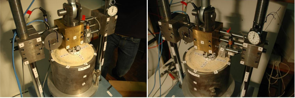 Figure 8 shows the test on a soft rock placed in a metal cylinder. A press generates a load by means of a small metal plate which simulates a foundation. The goal of this study is the determination of the characteristics of the soft rock. The image-based measurements were carried out with two Nikon D70 cameras, equipped with calibrated 20 mm lenses. Cameras were placed on tripods in order to fix their exterior orientation parameters. A solution based on targets was used. During this test two LVDTs were employed, but they provided information along the vertical line only. In this test, LVDTs were used to check the accuracy of the image-based measurements.